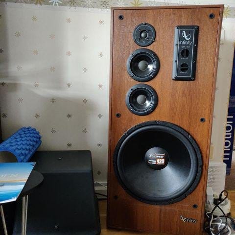 Infinity kappa 6 i Amerikansk ek+ förstärkare Andersson R2 360watt+Andersson subwoofer och center högtalare.Säljes i ett paket. Betalas med swich. De flesta av denna modell som sålts i övriga Europa har legat på ca 450 euro och nästan inga med golvstativ och i så bra skick som dessa.M.a.o. ETT FYND ! och de andra sakerna blir en stor bonus.