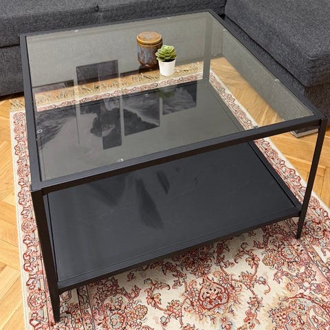 Fint glasbord i tre nivåer från Mio med mässingsramar. Glasskivorna går att ta loss. Lite slitage på ramen samt några rispor på översta skivan. Det går enkelt att byta översta skivan och istället använda någon av de andra två på toppen. I övrigt i fint skick! Tungt, krävs två för att bära.