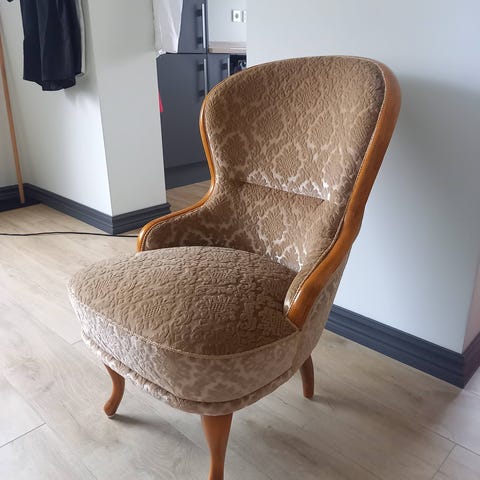 Nyligt renoverad och omklädd av mig på tibro hantverksakademi. Säljes då jag tyvärr inte rymmer den hemma. Omklädd i grön "krossad sammet" och ytbehandlad med linolja. Nysnörat resårhus och ny stoppning.