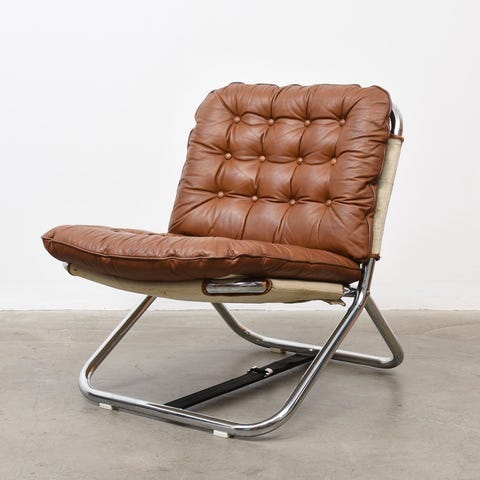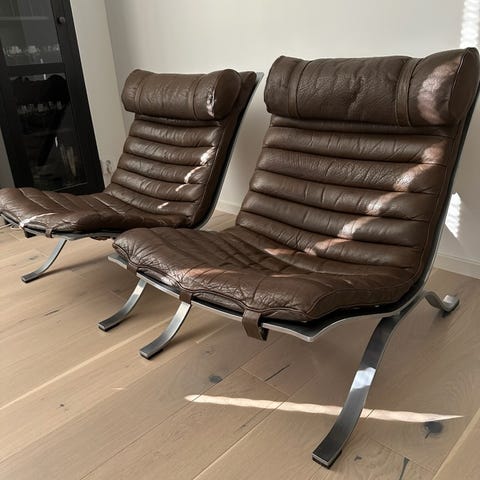 Ari av Arne Norell, formgiven 1966. Fantastisk patina och otroligt bekväm. Stomme polerat stål och skinnklädsel.