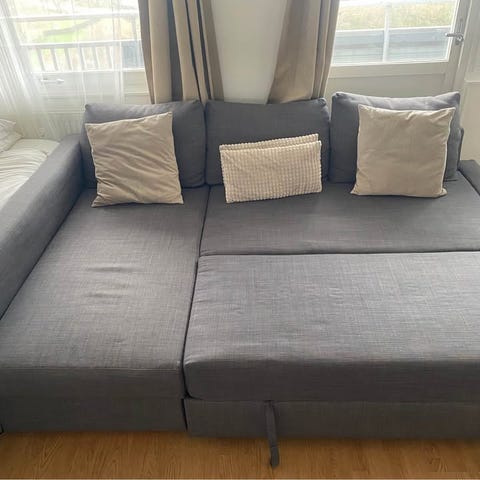 Mio hörnsoffa i ljusblått tyg. Soffan har en modern design med raka armstöd och generösa sittplatser samt med två nackstöd. Erbjuder komfort för flera personer samtidigt och fungerar bra som extrasäng. Addera 15 cm på soffhöjd där nackstöden placeras