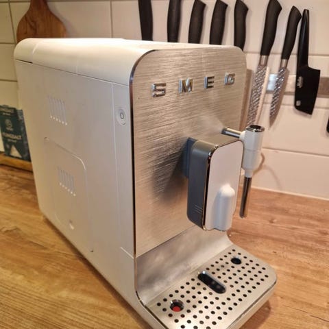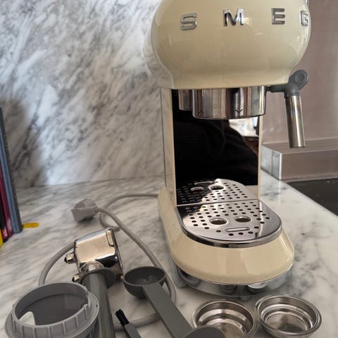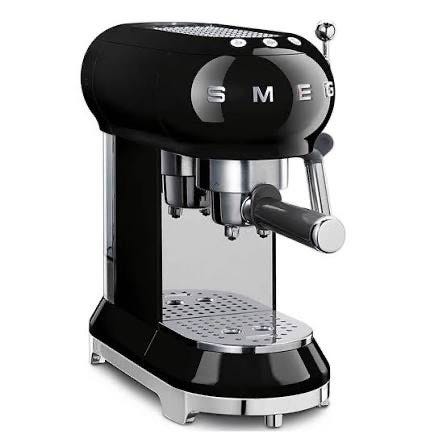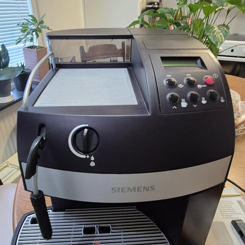Espressomaskin i svart färg. Maskinen har en klassisk design med flera knappar och en tryckmätare på frontpanelen. Den är utrustad med en avtagbar droppbricka och ett galler för koppar. Passar för användning i kök för att brygga espresso. Skicket är oklart, då den stått oanvänd under flera år.