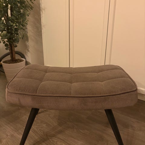 Andrew fotpall i sammet, färg midnattsblå. Fotpallen har ben med hjul och mässingsdetaljer.