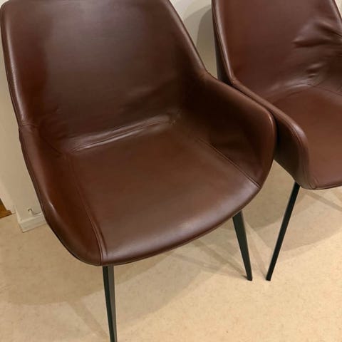 6 stycken massiva trästolar. Med snygga metallbeslag. Finns några perfekta brister som bara ger charm. jag har använt dem med svarta sittdynor som medföljer om man vill.