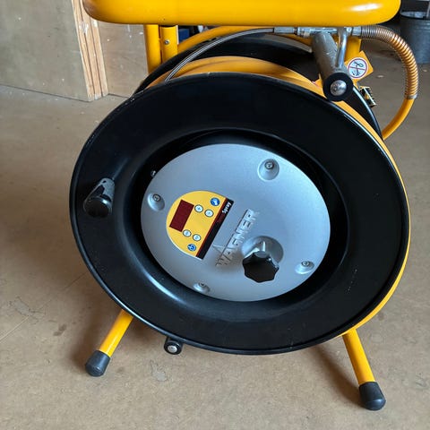 Aerfast AA3008R slangvinda med röd slang, monterad på svart ram. Kompressor slang 20 M. I mycket bra skick nästan aldrig använd. Kan köpas med kompressor för mycket bra paketpris.
