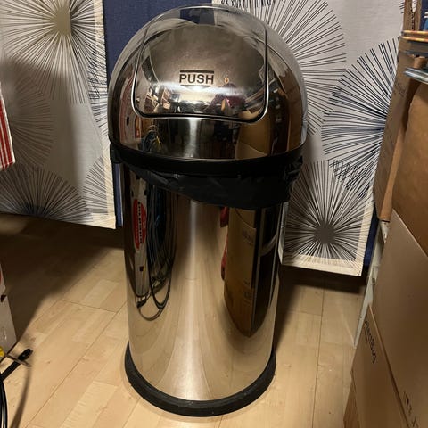 Brabantia soptunna i rostfritt stål med svart lock. Soptunnan har en oval form och är avsedd för hushållsavfall.