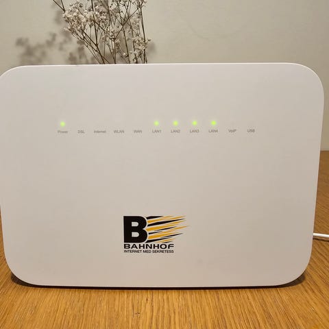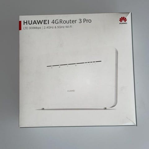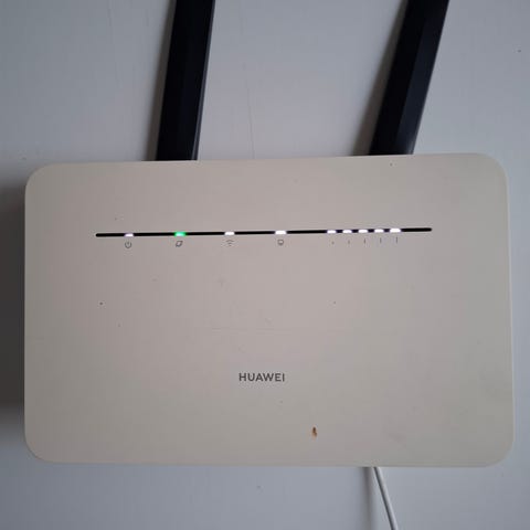 Huawei router olåst för nätverksanslutning med flera portar för LAN och telefonlinje, inklusive strömanslutning och USB-port.