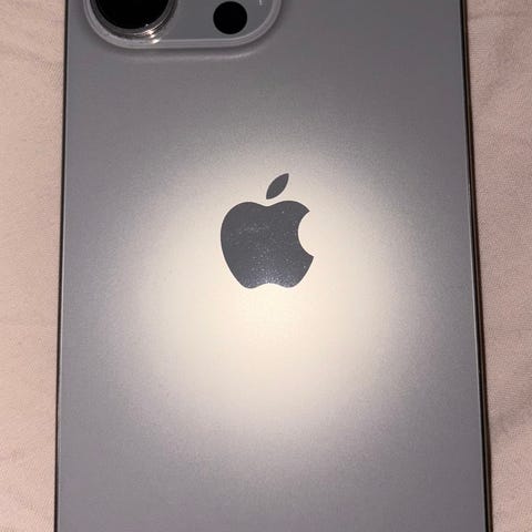 Apple iPhone 15 Pro Max 91% batteri smartphone med 256 GB lagringskapacitet. Enheten har en skärm med dubbel frontkamera och en bakre trippelkamera. Produkten är i färgen natural titan.