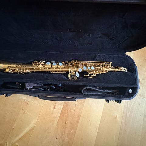 Dimavery böjd sopran. Bara demospelad saxofon så den är i 100% nyskick. Komplett med munstycke och bra case, bara att spela!