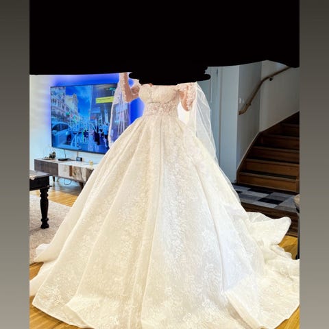 Båda slöja och underkjol tillkommer tillsammans med klänningen. Brudslöjan har pärlor på sig och längden är anpassad efter klänningen.
