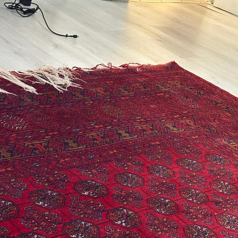 Afghanskmatta i fin kulör. Fina fransar. Kan behöva punkt förbättras på några ställen men fungerar också utan att man egentligen behöver göra något med den