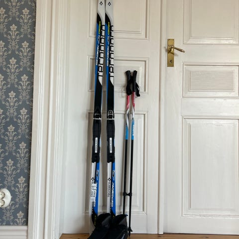 Längdskidor Fischer Sprint Crown 130 cm säljes med tillhörande pjäxor och bindningar av märket Salomon. Pjäxorna är i storlek 35 med innermått 220 mm.