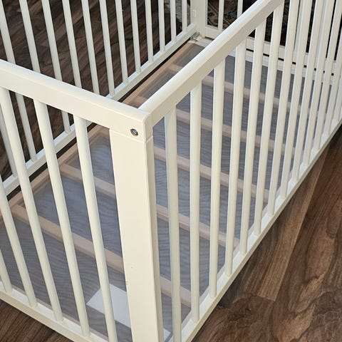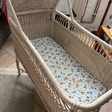 En fin rejäl spjälsäng, vitmålad i trä med uggla målad på kortändorna. Sängen kan höjas och sänkas i två lägen. Fräsch madrass ingår.