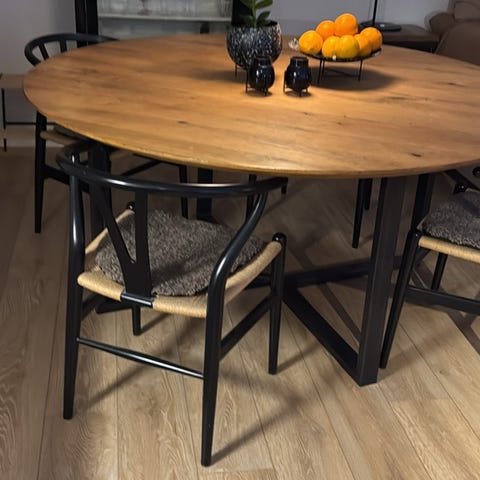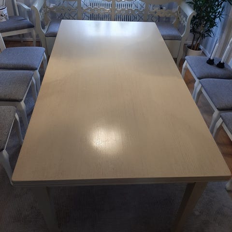 Stort matbord i klassisk design av massiv, fingerskarvad ek. Bordet är i hög kvalitet och kan, bredd 95 cm, höjd 75 cm.