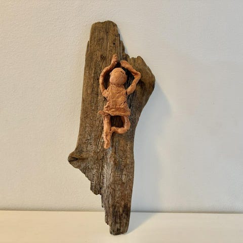 Träskulptur föreställande två personer i en sittande och böjd position. Skulpturen är handgjord i trä och visar detaljerad karvning av människokroppar och textur på träytan. Passar som dekorativ konstföremål.