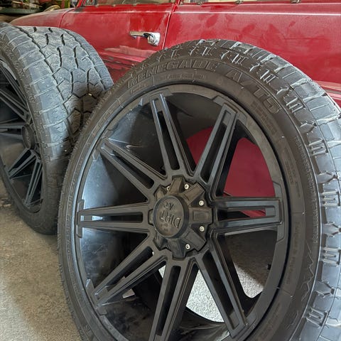 Komplett set 22” fälgar med grova offroaddäck (33x12.50R22) i mycket bra skick.
