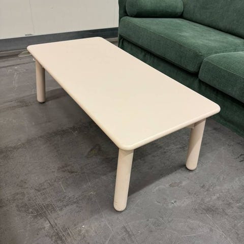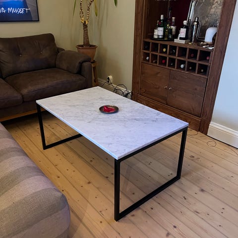 Väldigt fint skick, jag har satt dubbelhäftande tejp mellan skivan och benen (enbart för lättare transport och ommöblering).