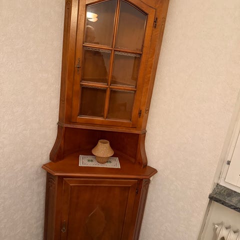 Vägghängt antikt skåp, glasvitrin, i bruksskick. H= 68 cm. B= 50 cm. D= 24 cm. (Hyllans djup=20 cm., längd=44 cm.) Från Skelleftebygden. Knoppen är ej i original. Skåpet skickas inte.