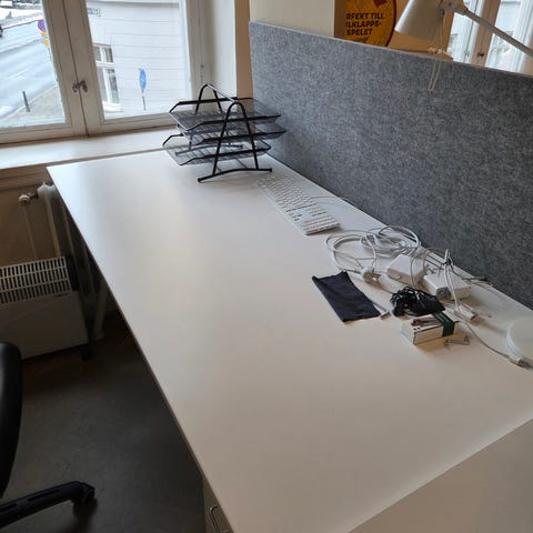 Höj och sänkbart skrivbord från IKEA, skivan har synliga märken och hål.