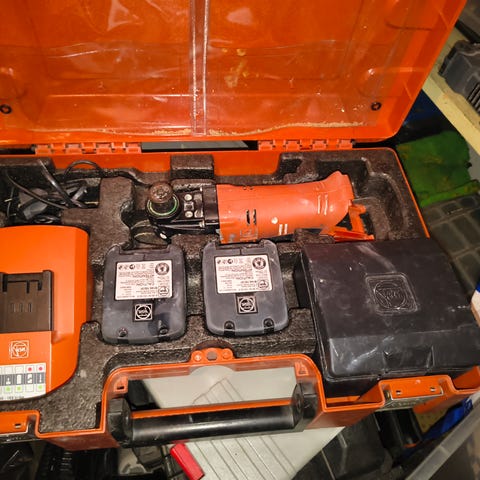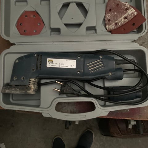 Fein Multimaster oscillationsverktyg i orange färg. Verktyget är elektriskt och används för olika typer av kapning, slipning och skrapning. Levereras i förvaringslåda för enkel hantering och förvaring.