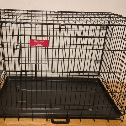 Dogman Hundbur i svart metall. Buren är avsedd för hundar och ger en säker och rymlig plats för transport eller vila. Den är tillverkad av metall med ett gallerdesign som ger god ventilation.