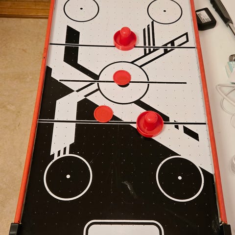 Airhockeyspel med fungerande fläkt och manuell poängställning.