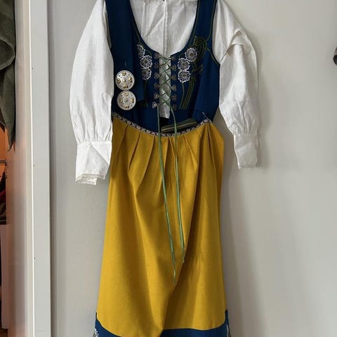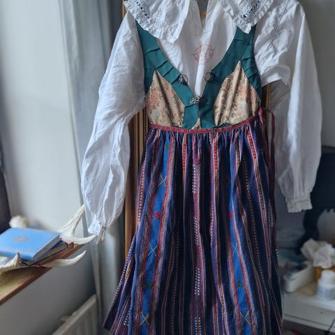 Nya tvåändsstickade ullstrumpor till Rättviksdräkten. Äkta skinnskor med lädersula och Rättviksplös.