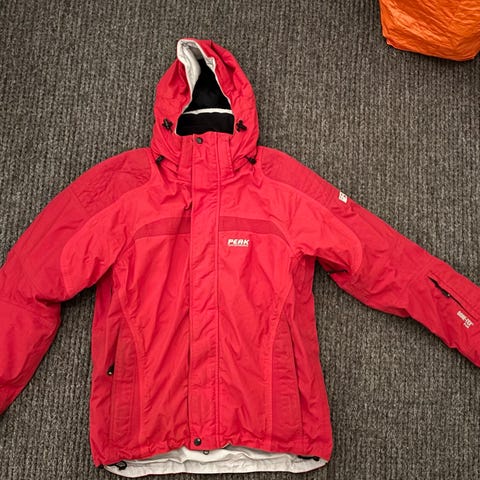 Svart Peak Performance jacka goretex med hög krage och dragsko nedtill. Jackan har logotyper på bröstet och ärmen.