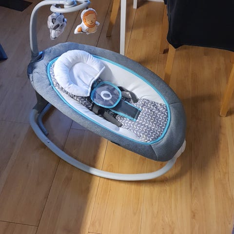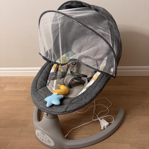 Babygunga med myggnät och LED-display. Har 5 olika hastigheter samt olika musikinställningar. Styrs med fjärrkontroll. Bär upp till 10kg i rörelse samt upp till 15kg statiskt. Väldigt smidigt att ha när man ska tex laga mat/duscha/städa och ha bebisen bredvid sig.