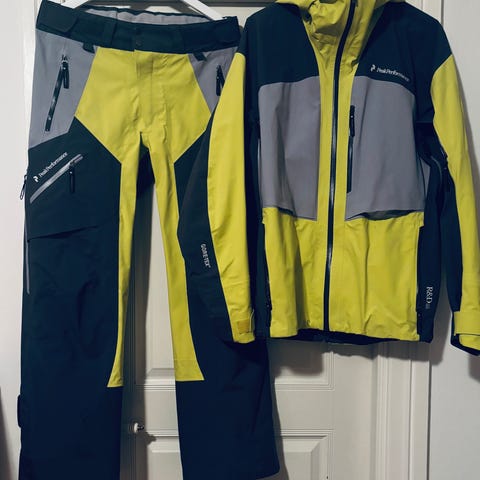 Gore Tex skidställ. Vatten och vindtätt. Hög midja på byxorna med bekväma hängslen. Snölås/resår vid händer o fötter. Många justeringsmöjligheter. Kan provas i centrala Göteborg.
