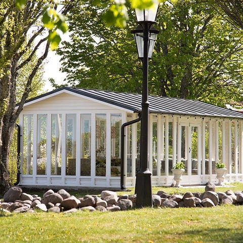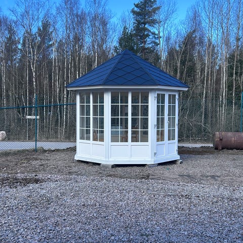 Ett 11-kantigt lustväxthus från Hortum Växthus som är ca 25 kvadrameter stort. Jättefint att sitta i när det är kallt och blåsigt ute och funkar bra till odling också. Teknisk spec finns på hortumvaxthus.se Det är nästan exakt samma modell som deras 12-kantiga.