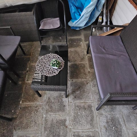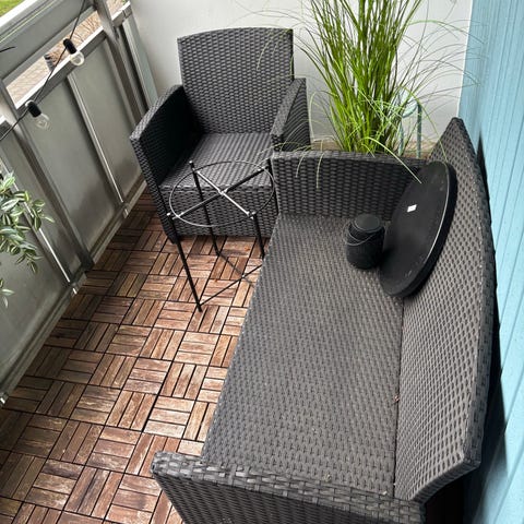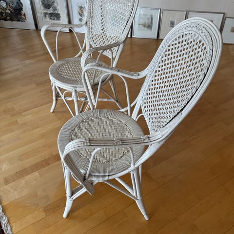 Rottingmöbelset bestående av soffa, 4 fåtöljer och två bord. Möblerna är i trä rottingf och inkluderar vita dynor. Dynorna går att tvätta. Möblerna har möglat av en vinter ute men går troligtvis att rengöra/måla. Köpta på Ikea.