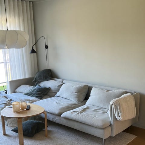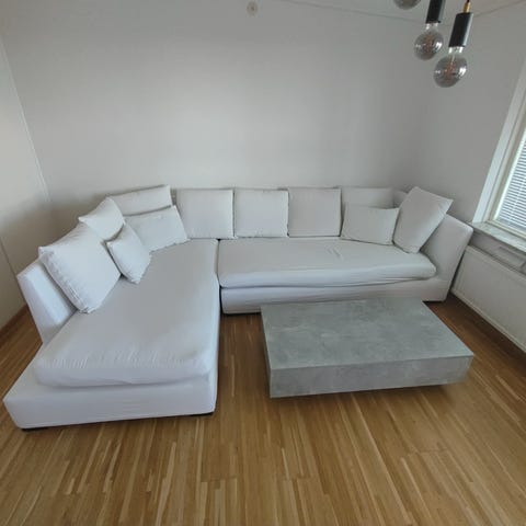 Säljer min magiska 4-sits soffa med en hel sittkudde och tre ryggkuddar i tyget Tristan Sand. Två prydnadskuddar medföljer.