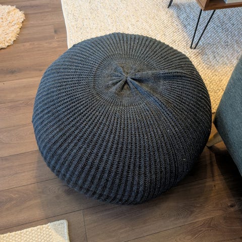 Stilren och praktisk designpuff i grått tyg, köpt på JYSK.