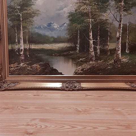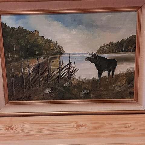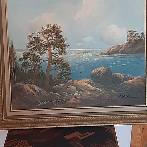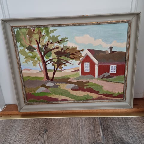 Oljemålning som föreställer ett landskap med ett hus, träd och en stig. Målningen är signerad i nedre högra hörnet. Inramad med en ljus träram.