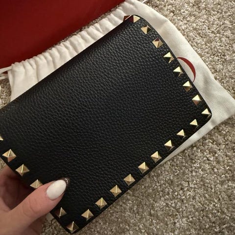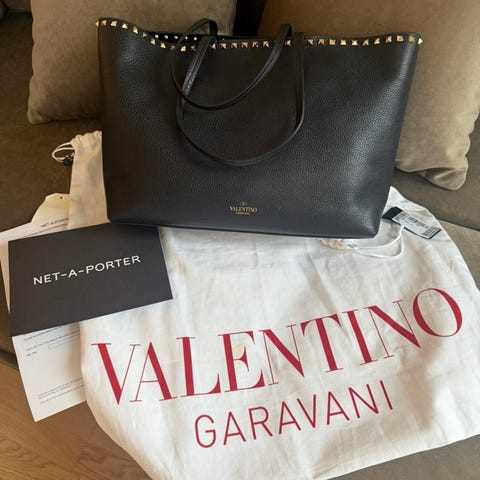 Valentino läderväska för kvinna i grått läder med nitar längs kanten. Väskan har en kedja och flera fack invändigt, inklusive ett med dragkedja. Levereras med skyddspåse.