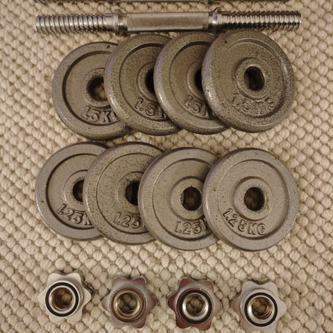 Abilica Weight Set 9 kg hantelset med vikter i stål och gjutjärn. Setet inkluderar 4 vikter (1,25 kg och 2,5 kg), en kromad stång med längd 35 cm och diameter 25 mm samt stjärnformade lås. Total vikt är 9,2 kg. Ord pris ca 800kr
