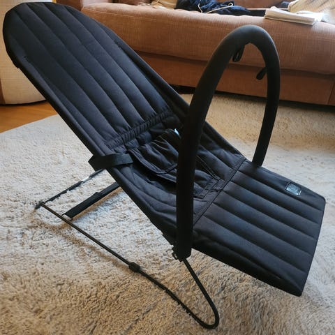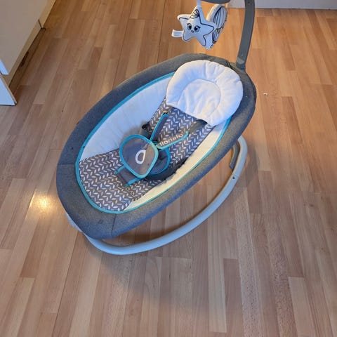 Babysitter och spjälskydd avsedd för barn. Produkten är designad för att användas som sittplats för barn och är utrustad med säkerhetsbälte och leksaker för barnets underhållning. Färgen är huvudsakligen vit med detaljer i svart och rött. Material och ytterligare specifikationer är inte angivna.