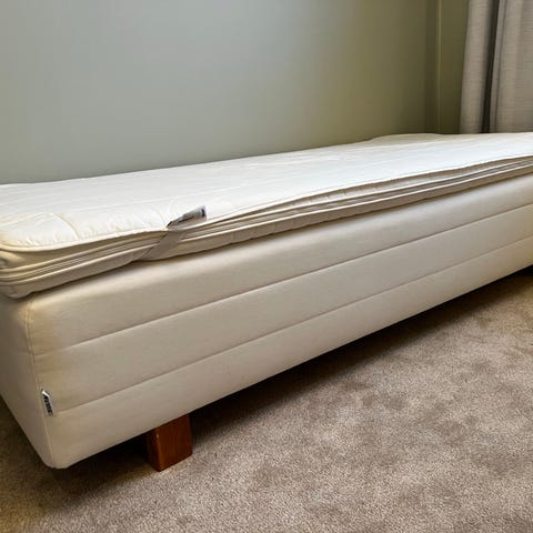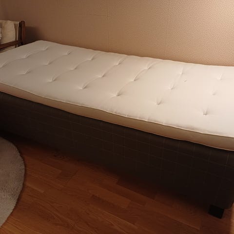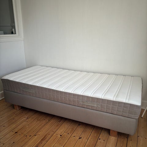 Säljer en 90 säng med bäddmadrass och silvriga ben. Skotterud, medium/fast. Använd i några månader.