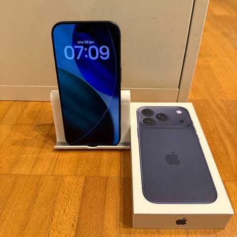 Apple iPhone 17 Pro mobiltelefon med 256 GB lagringskapacitet i blå färg.