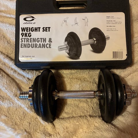 Minns ej vikt på skivstång. 2 st plattorx2,5 kg samt 2x 5kg samt 2x 1,25kg.