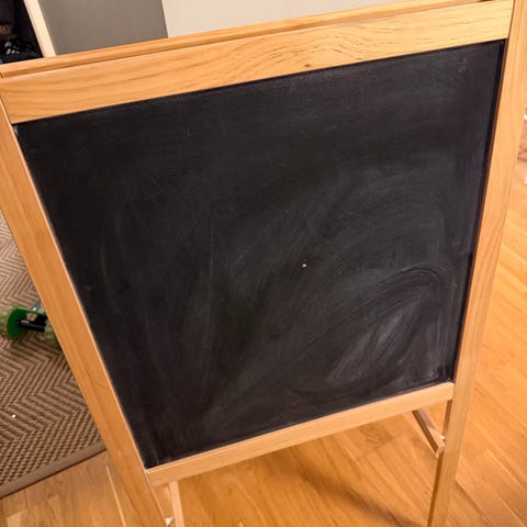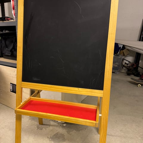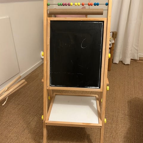 Praktisk möbel för barn, där både pennor och kritor avsedda för respektive sida medföljer. Praktiskt med avläggningsyta för kritor och pennor nedtill (vilket IKEAs nuvarande variant inte har kvar.) I fint skick, men har en liten repa på den svarta sidan utan betydelse för funktionen. Finns i Trosa, men vi far regelbundet till Sthlm och Nyköping om det hjälper.