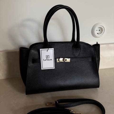 Ny LaTalia väska i läder i svart färg . Väskan har två justerbara axelremmar och flera innerfack. Väskan stängs med en dragkedja och locket stängs med en magnetknapp. Materialet är läder och designen är enkel och funktionell.