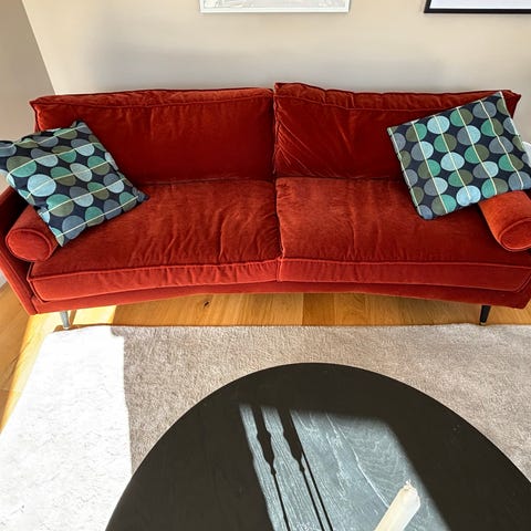 Enastående tillfälle!Design soffa Altero, som ny,vinröd sametstyg Textil Royal,tillverkad 2018 av Thomas Julienne.Köpt på Planett AB, Birger Jarlsgatan,Stockholm.Hämtas i Centrala Stockholm.