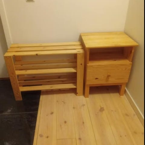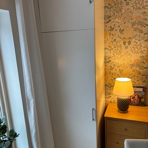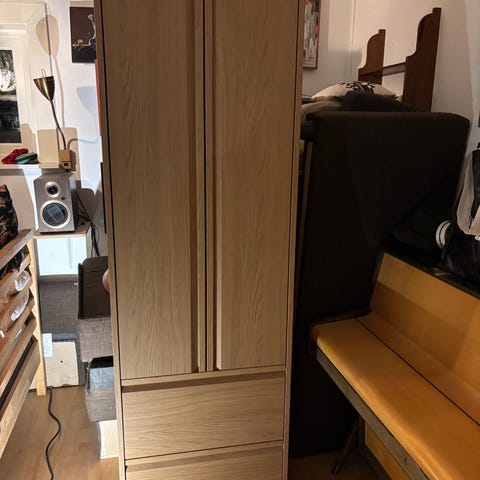 Två höga bonde-skåp (ikea) i björkfanér. Gott om förvaring bakom skåpdörrar. I varje skåpsdel finns ett hyllplan. Den vänstra skåpdelen i mitten är inredd som ett barskåp med glashylla, belysning och spegel på bakstycket. Syns tyvärr inte på fotot.