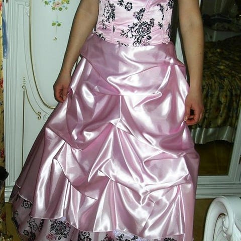 Rosa, enaxlad långklänning med paljetter och en dekorativ detalj på axeln. Klänningen har en dragkedja baktill och utsvängd kjol som fäller ut i ett lätt släp baktill. Några av de stenar som är på axeln sitter löst men man kan enkelt sy de fast.