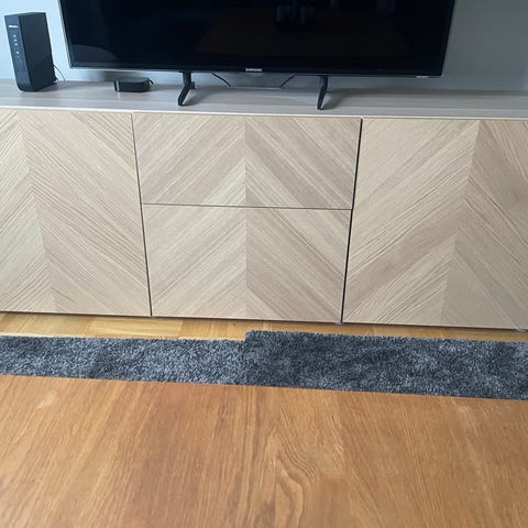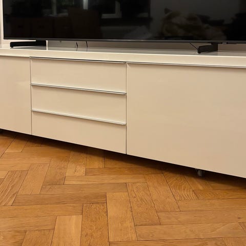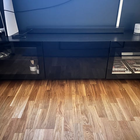 Använd som TV-bänk, med Valviken-dörrar och push-open installerat.