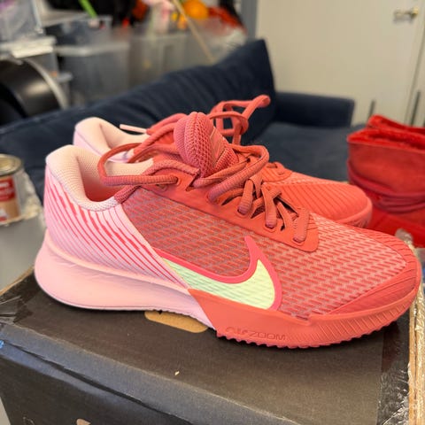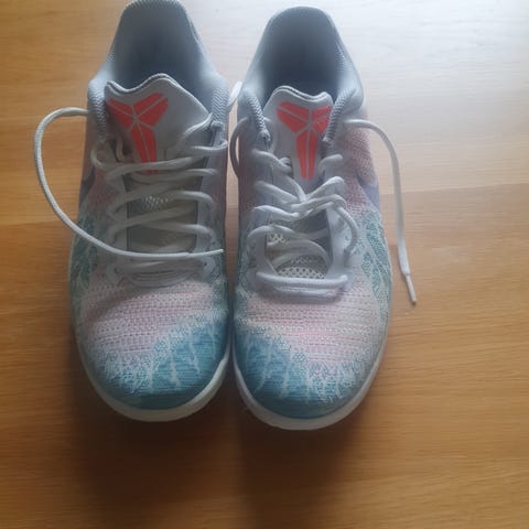 Nike Kobe basketbollskor i storlek 40.5 färg röd. Skorna är designade för basket och har en röd ovandel med vita detaljer. Sulan är vit med mönster för grepp. Modellen är anpassad för sport och har signaturdetaljer kopplade till Kobe Bryant.