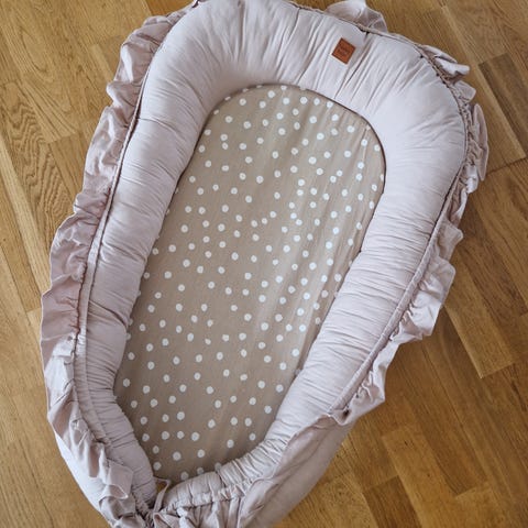 Fint paket med babytextilier bestående av ett sandfärgat babynest från Buddy & Hope i one size, en stickad filt i taupe från Buddy & Hope samt en vit kanin snuttefilt från Hemtex. Babynestet och filten är i fint skick, men det har gått upp lite tråd på nedre delen av babynestet, vilket är mycket lätt att laga och påverkar inte funktionen, se bild. Snuttefilten är endast tvättad och aldrig använd.