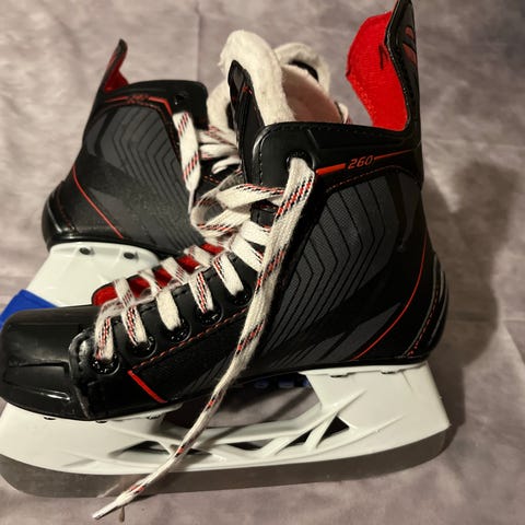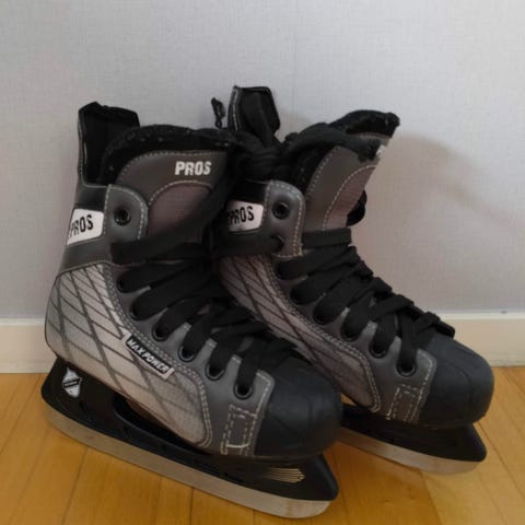 Ishockeyskridskor för barn i storlek 34-37 med justerbar storlek. Skorna har en kombination av material och är designade för ishockeysport. Färgkombinationen är huvudsakligen vit med svart och orange detaljer.